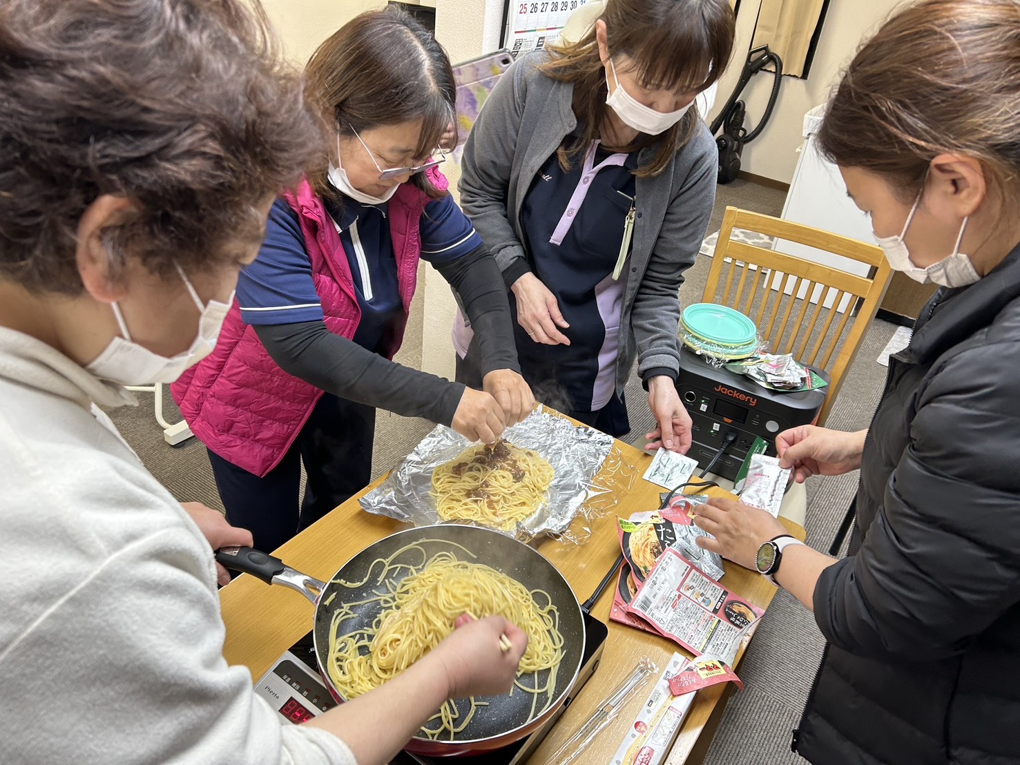 災害時に備えて、事務所に備蓄していた非常食を使い、災害時を想定しながら「あるもの」をフル活用して調理に挑戦‼️