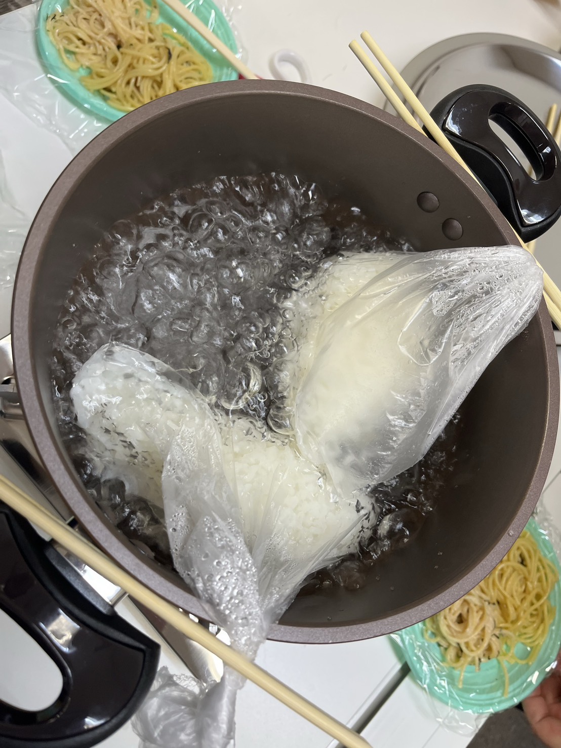 今回はパスタ、餅(あんこディップ)、白米を調理しました。白米はアイラップで炊けるみたいよー。と情報をもらい、本当に炊けるか半信半疑でしたが、いざ作ってみるとしっかり美味しい❤️
