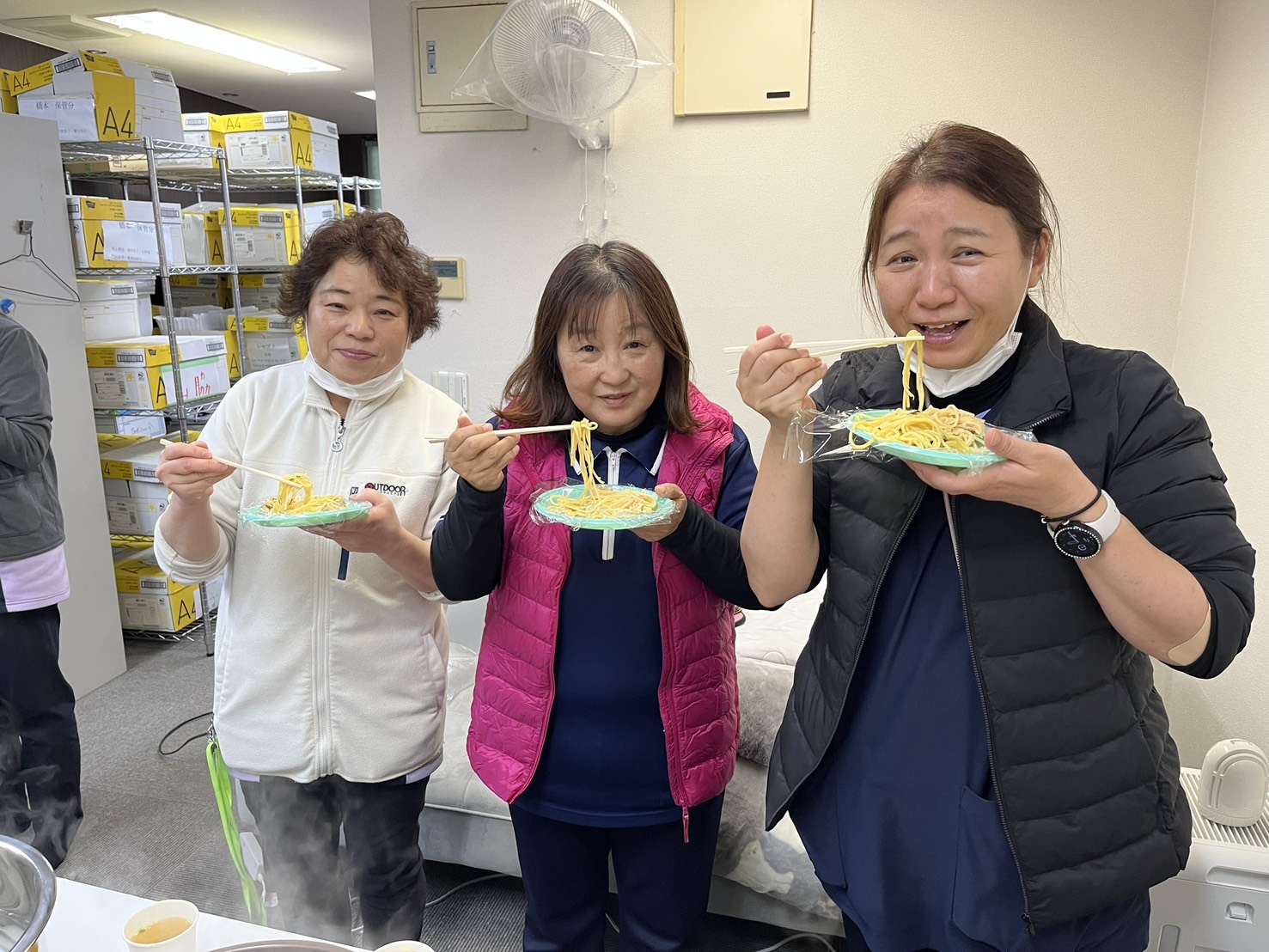 立食スタイルで非常食パスタ